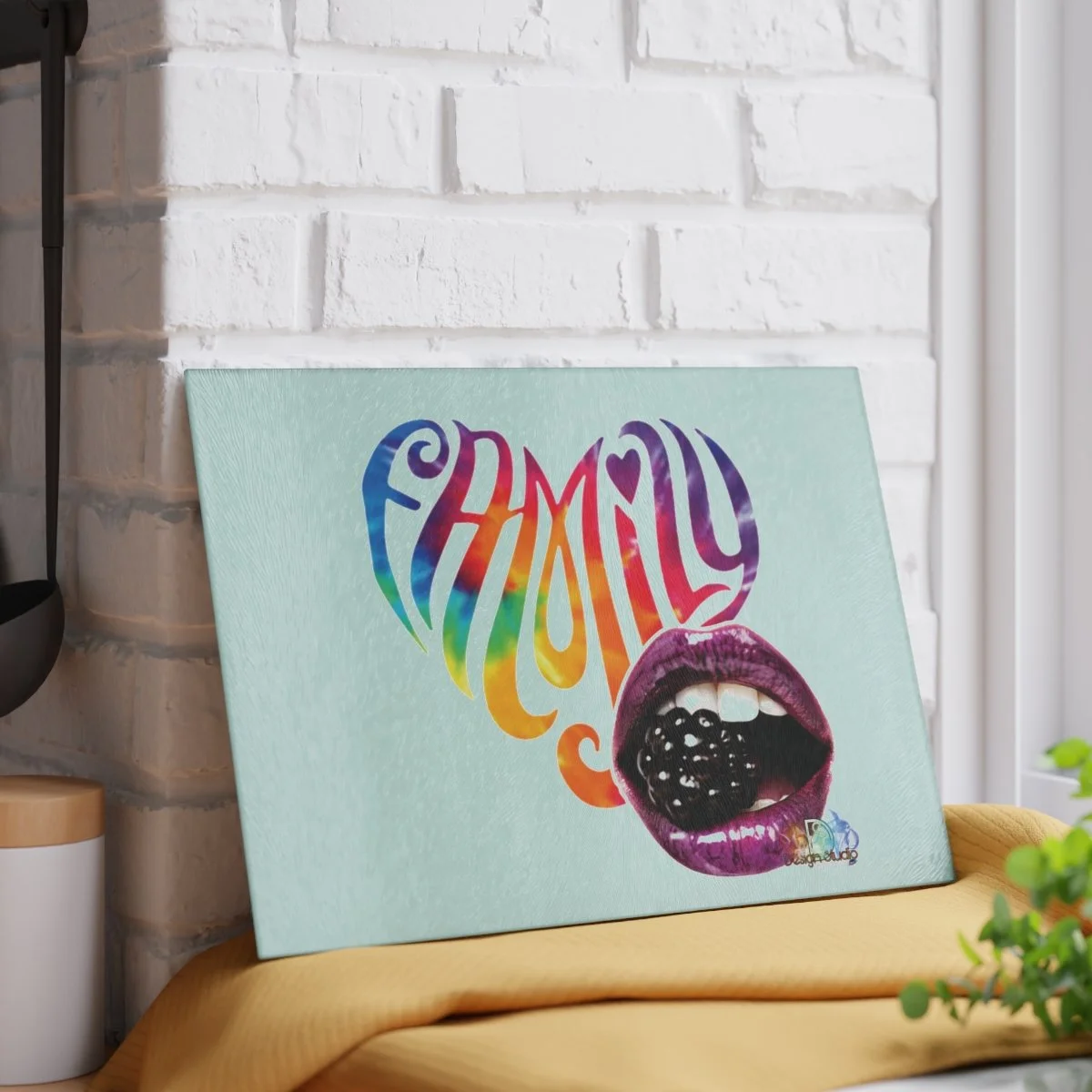 Transform everyday cooking into a vibe with this vibrant Glass Cutting Board from DesignStudio by Figure.Vision. Featuring a striking rainbow “Family” graphic and glossy berry-kiss artwork, this piece doesn’t just sit on your counter; it steals the show.